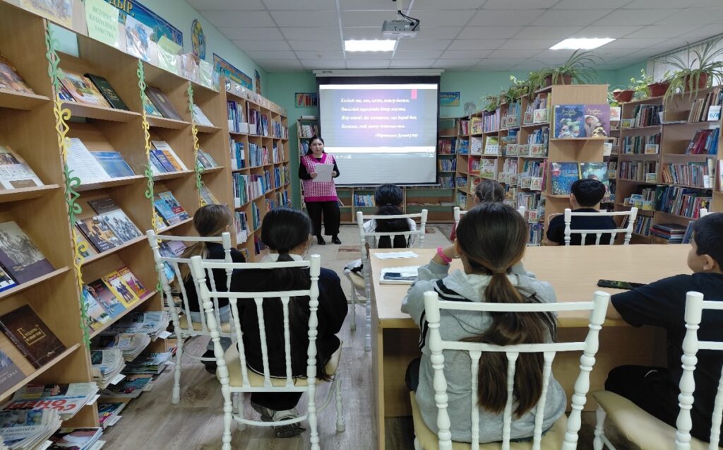 17 октября 2025 года в нашей библиотеке прошёл литературный урок под названием «Мыржакып Дулатов — народный поэт», посвящённое 140-летию со дня рождения Мыржакыпа Дулатова.Наша цель — познакомить детей с творчеством и общественно-политической деятельностью Мыжакыпа Дулатова, а также сформировать у молодёжи патриотическое сознание.В рамках мероприятия была показана видеопрезентация с участием учеников «казахской школы имени Сапара Ергалиева».Ребята познакомились с биографией и произведениями Мыржакыпа Дулатова.Кроме того, была проведена викторина в формате «вопрос-ответ».