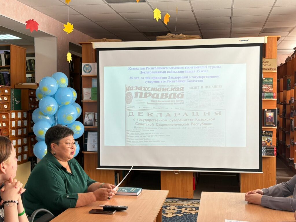К этой дате 22 октября в читальном зале центральной районной библиотеки прошел час истории «Первый шаг на пути к Независимости». На мероприятие были приглашены сотрудники государственных учреждений, работающая молодежь района. Руководитель ЦБС Асанова Г.Ж. рассказала о важности этого исторического документа как первого значительного шага на пути к полной независимости страны. Остановилась на важнейших этапах становления Республики. Гости мероприятия активно делились своими воспоминаниями о том времени и говорили о достижениях, которых страна добилась за годы независимости. Активный читатель библиотеки Зыбалева А.А. прочитала свои стихотворения о родном крае, о Родине.
