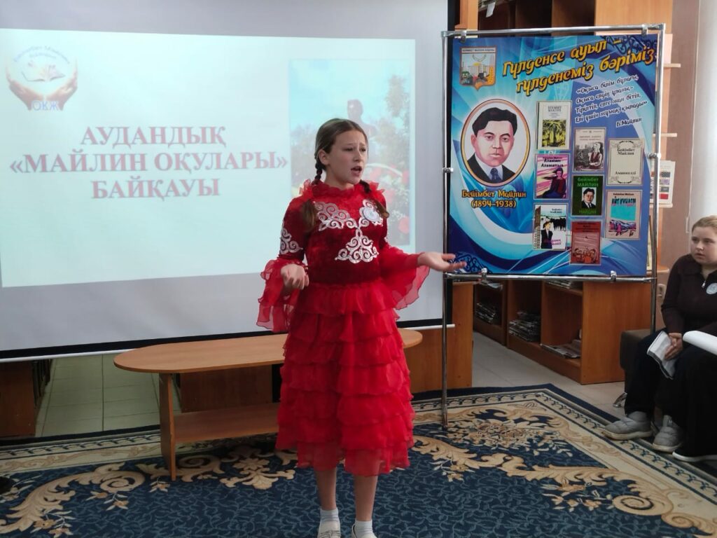 14 ноября, к дню рождения классика казахской литературы, нашего земляка Беимбета Майлина, в читальном зале центральной районной библиотеки состоялся ежегодный районный конкурс чтецов «Майлин оқулары». Конкурс проводился среди учащихся школ района 7 – 11 классов. В рамках Положения необходимо было исполнить на казахском или русском языке отрывок из прозаического произведения Б. Майлина.