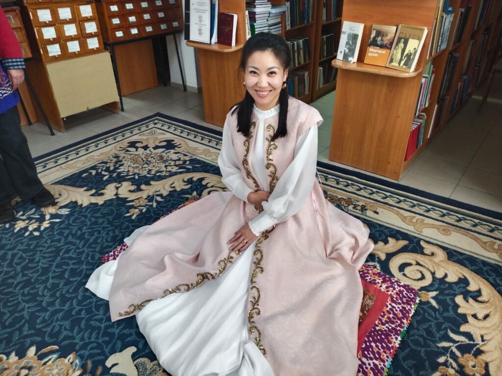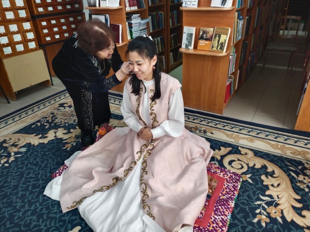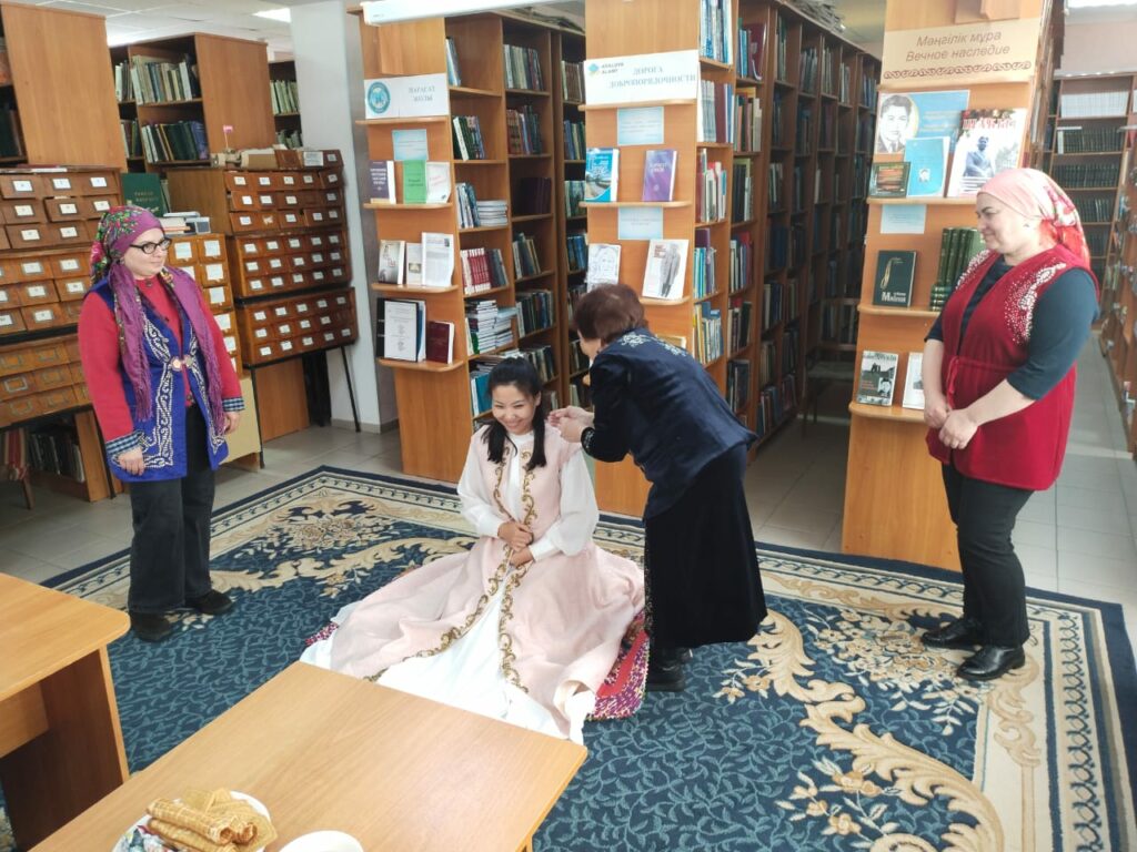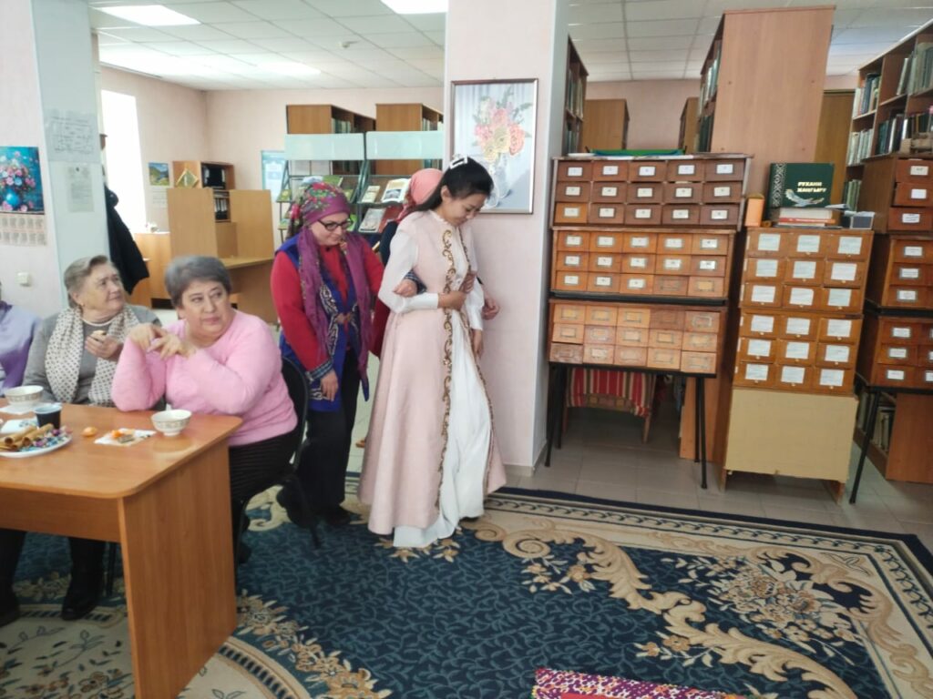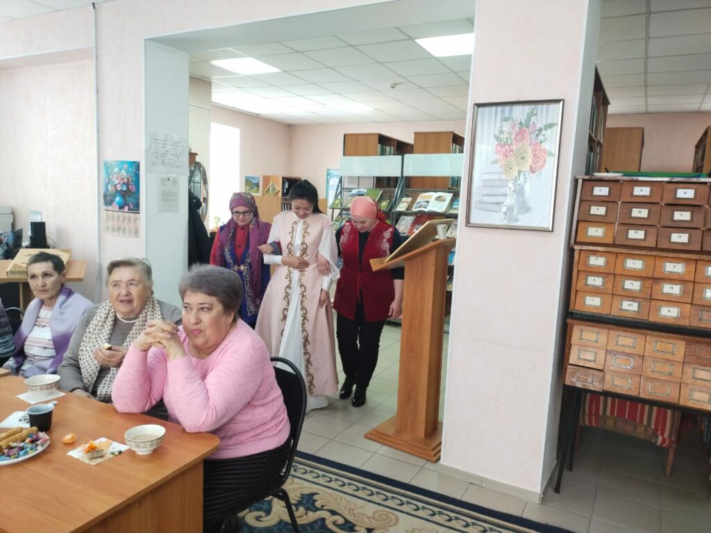 Особое внимание привлекла демонстрация красивого и трогательного обряда «Сырға салу». В нем приняли участие участница клуба «Встреча» Роза Сырлыбаевна Турманова и работники библиотеки. Этот древний обряд символизирует согласие двух семей на брак и официальное объявление девушки невестой. Такое живое прикосновение к традициям позволило участникам по-настоящему почувствовать атмосферу национальной культуры.